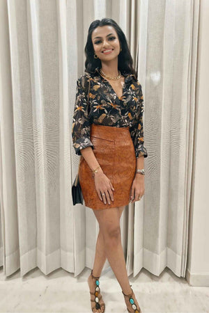 Elevate your style with the captivating croc texture that graces this skirt. The structured faux leather fabric boasts a rich and opulent look, while the bold burnt orange tint adds a touch of vibrancy that's hard to ignore.