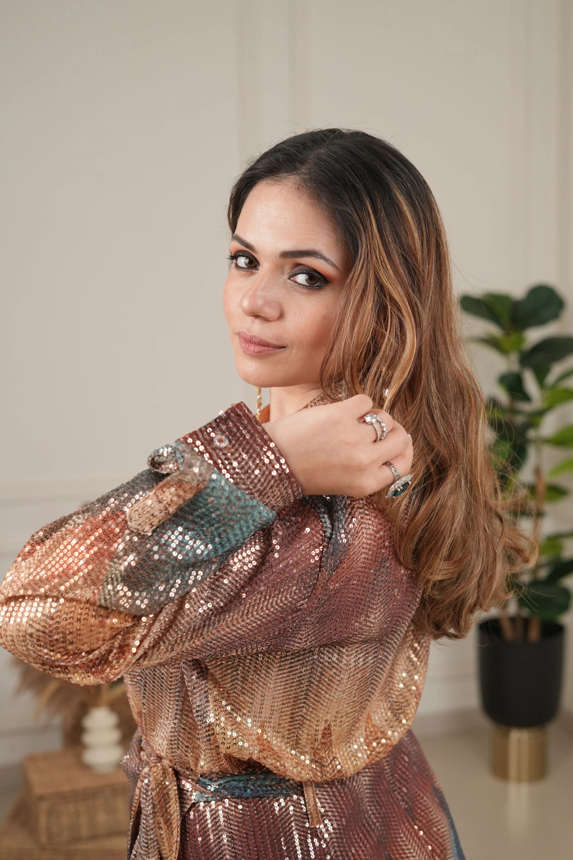 For a beach party look, wear the Multicolour Sequins Oversized Shirt as a cover-up over the Multicolour Sequins Bikini Top and Skirt. Complete the ensemble with metallic sandals, layered necklaces, and a straw hat for a chic and glamorous vibe