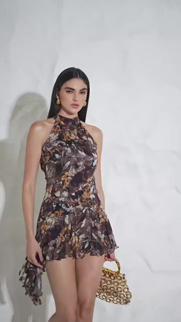 Cut in airy printed chiffon, this halter mini frames the shoulders with a neat high neck and keyhole tie-up at the back. The bodice sits close, then kicks out into an asymmetric ruffle hem that skims the thigh. Fully lined for coverage; concealed back zip for a clean finish. The warm abstract print reads rich and seasonless.