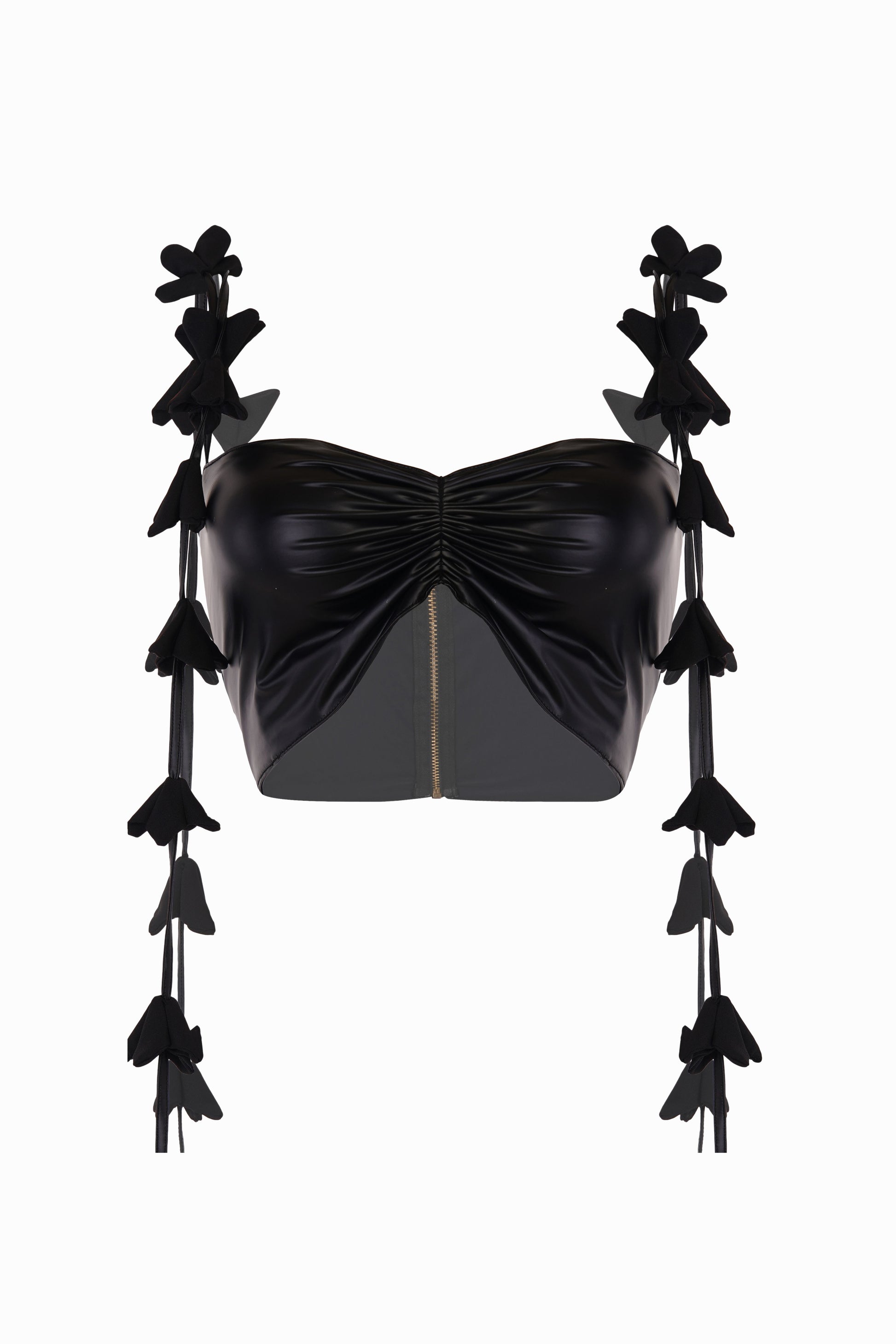 Step into the limelight with the Bella Top and Raven Cutwork Pants Co-ord. The ruched faux leather crop top with playful floral appliqués pairs seamlessly with intricately cutwork-detailed bell-bottoms, creating a sleek, statement-making look. Perfect for evenings out, this ensemble blends structure and movement with undeniable modern edge.