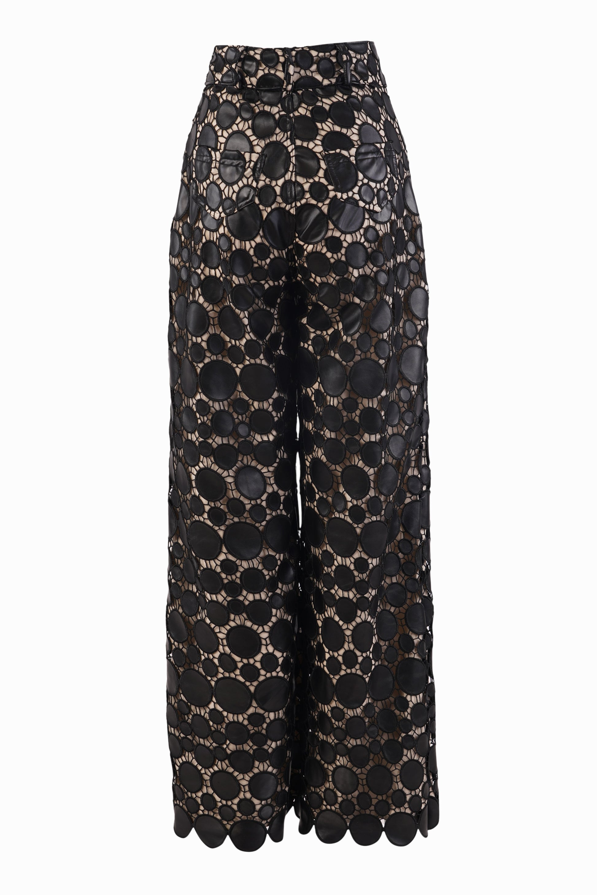 The Raven Cutwork Pants are a statement-making piece, crafted from faux leather with intricate cutwork detailing. Featuring a bell-bottom silhouette and bold color block lining, these pants add dimension and movement to your look. Pair them with the Bella Ruched Top for a head-turning ensemble perfect for evenings out.