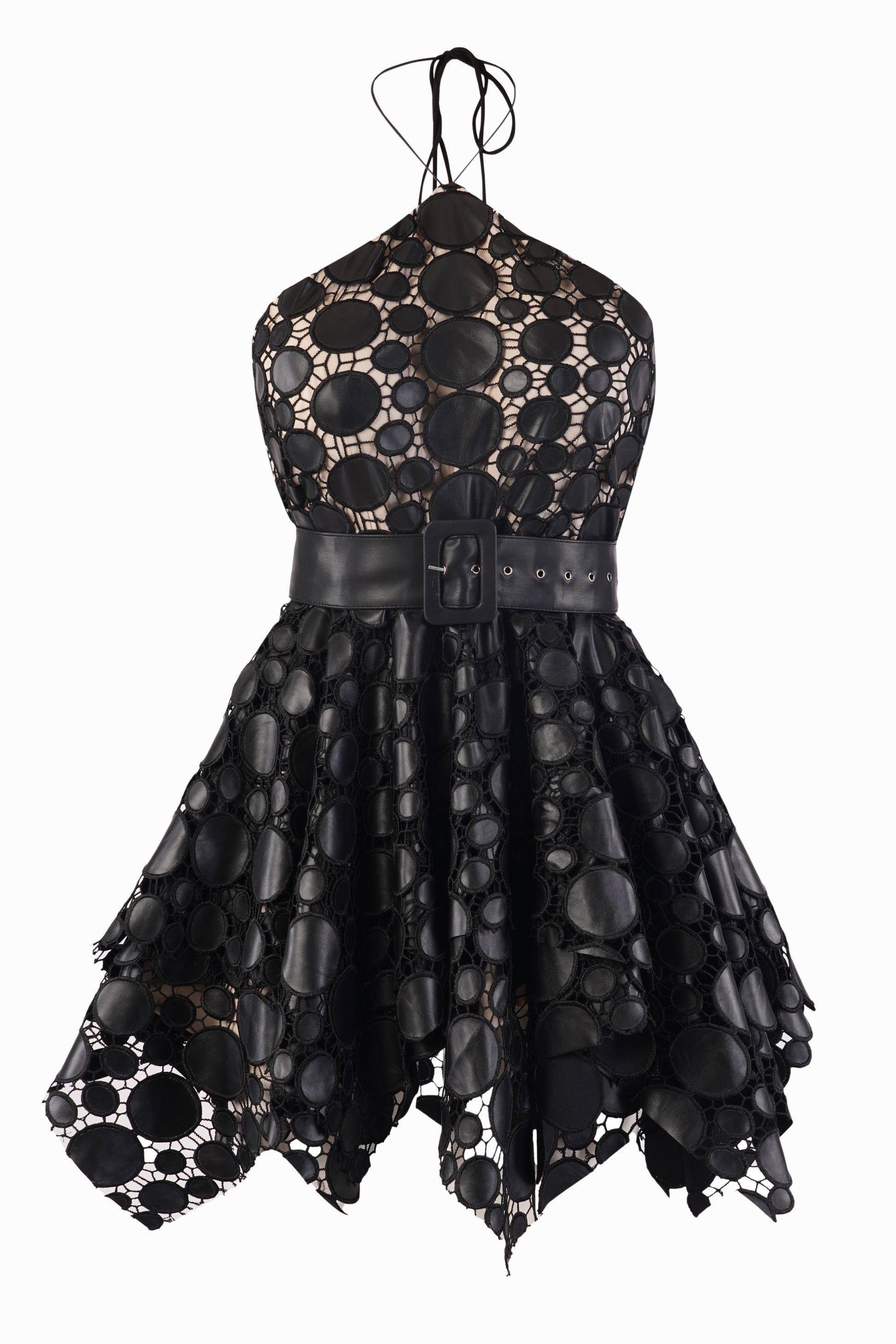 This halter-neck mini dress stands out with its bold faux leather construction and geometric cutwork detailing. The ruffled asymmetric hem creates dynamic movement, while the concealed side zipper ensures a seamless fit. The Raven Ruffle Mini is your go-to for edgy yet refined party looks.