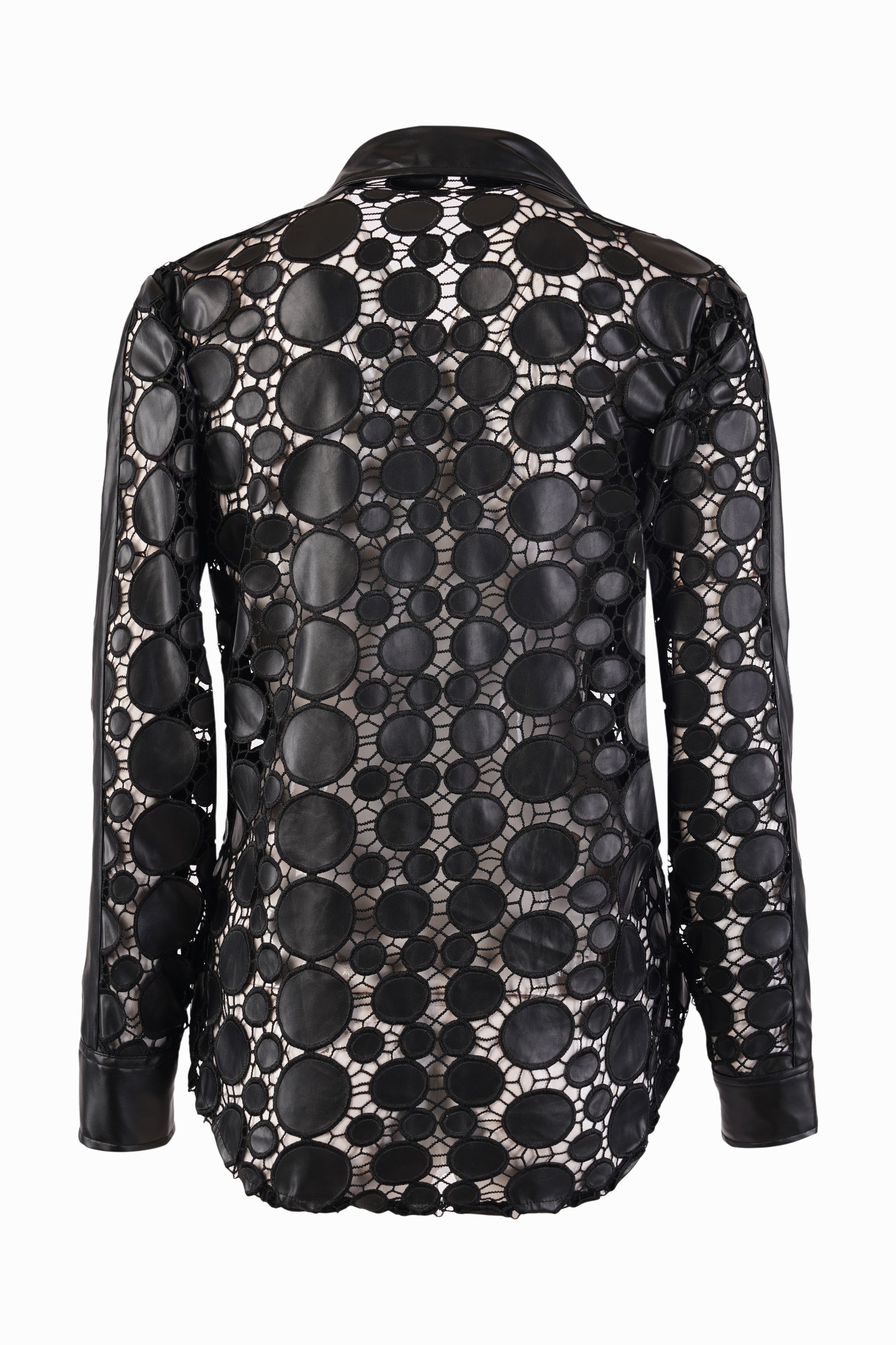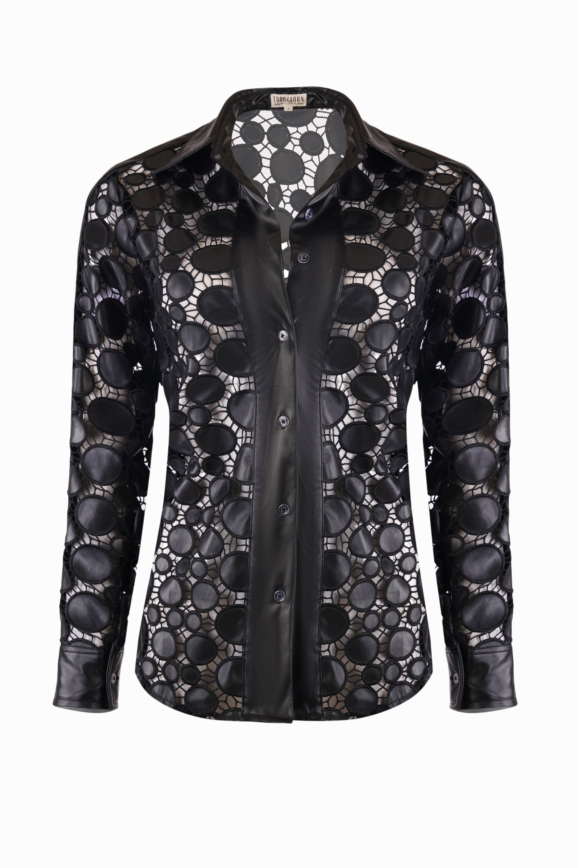 The Raven Cutwork Shirt is a bold take on contemporary design, crafted from faux leather with intricate cutwork detailing for a statement-making look. Featuring an oversized fit and a button-down front, this shirt offers structure and edge. Pair it with our Black Leather Mini Skirt for a sleek, high-fashion ensemble.