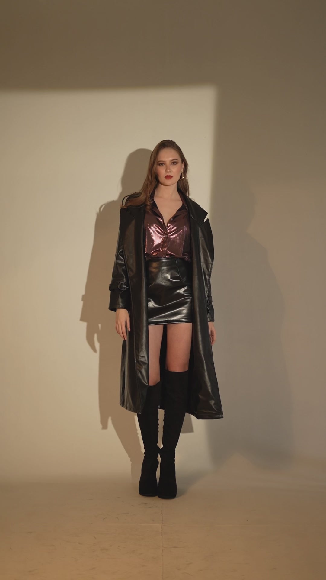 Style tip- The Black Faux Leather Trench is a versatile winter staple. Pair it with knee-high boots and a turtleneck for a chic winter ensemble. For an office-ready look, layer it over a formal attire, instantly adding edge. Or, elevate a dress by throwing this trench over for a stylish, layered effect, showcasing its versatility for various occasions.