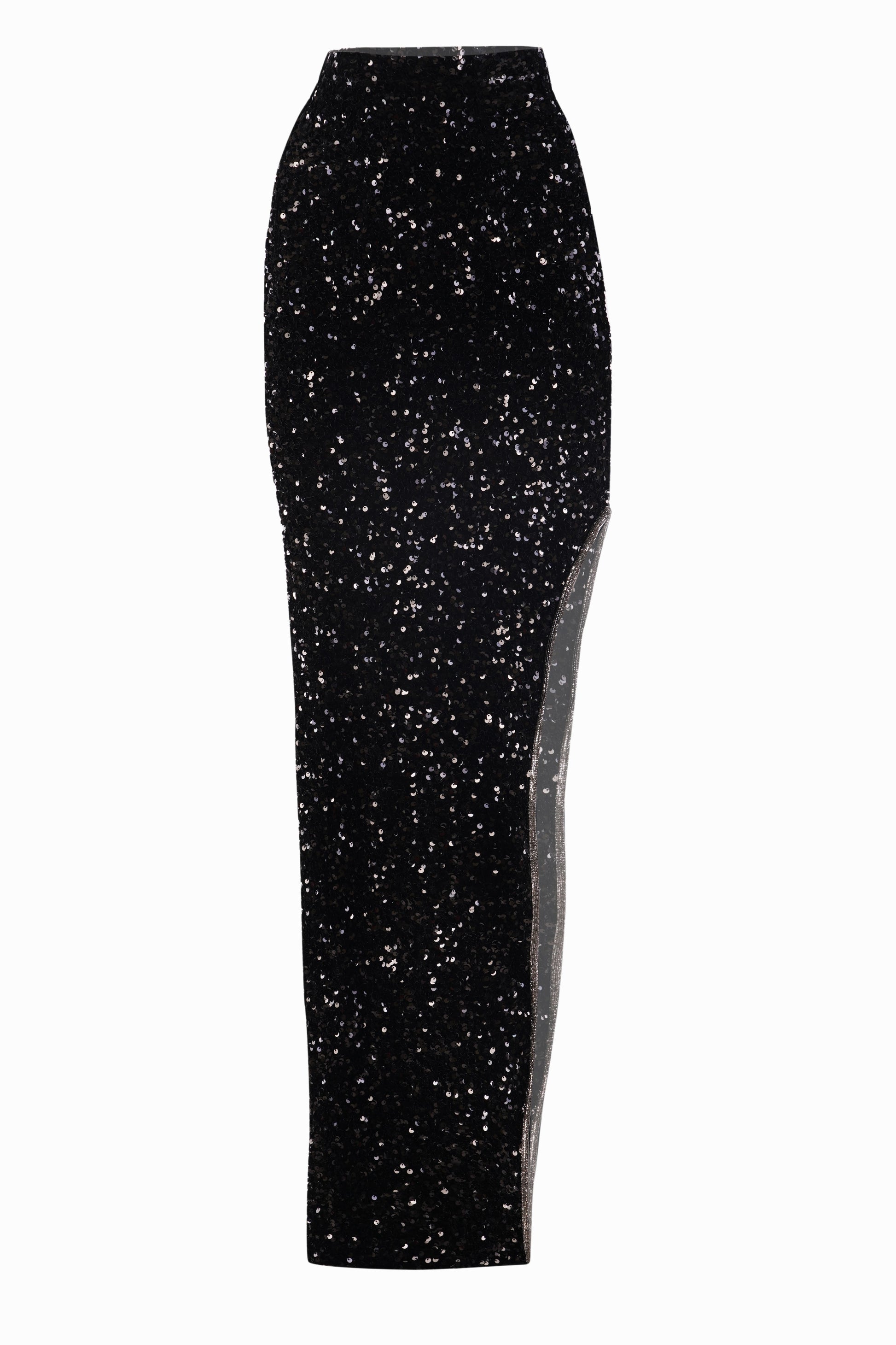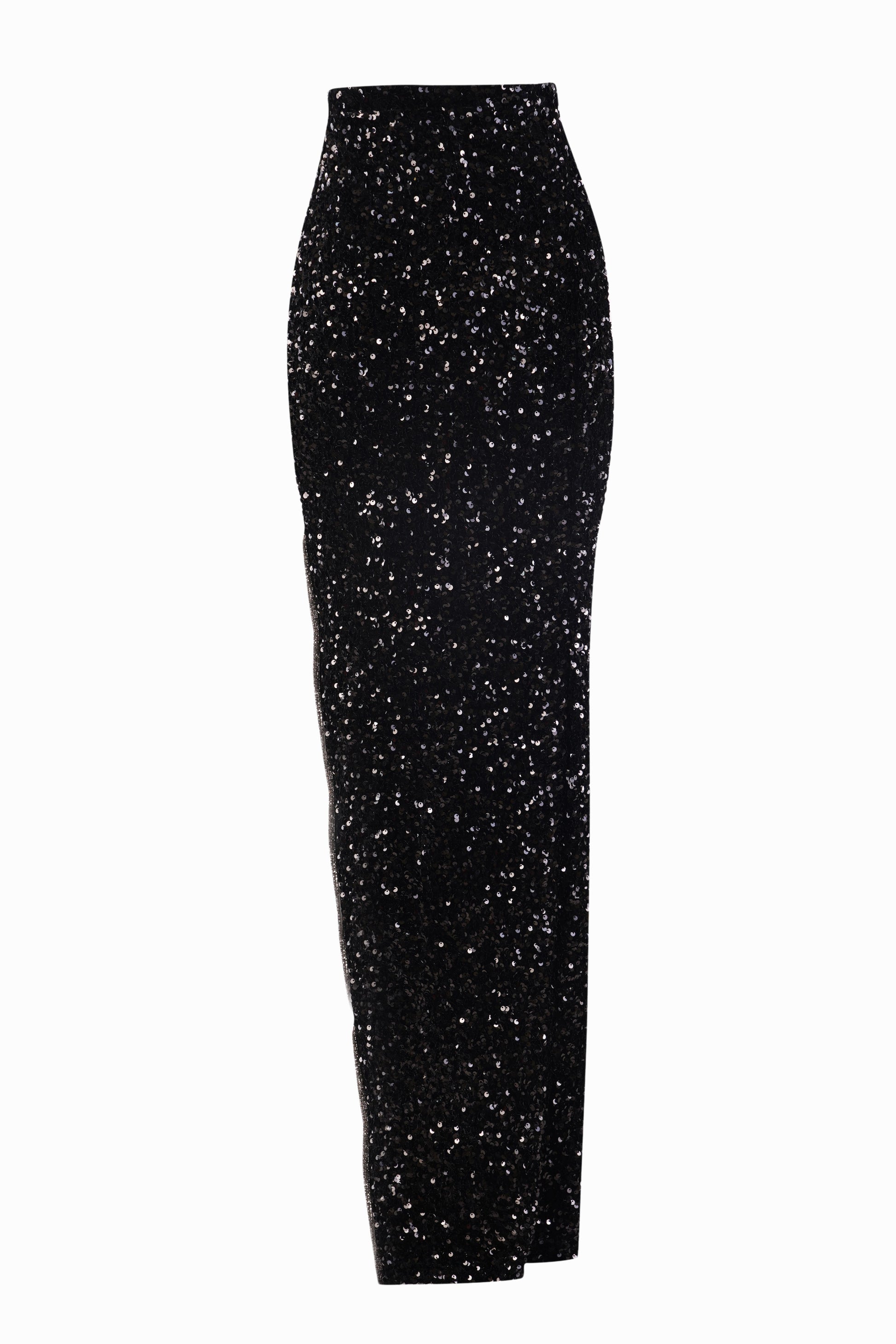 Turn heads in this black sequined maxi skirt, designed with a super high-waisted fit and an asymmetric thigh-high slit that adds movement and drama. Featuring shimmering rhinestone detailing along the slit, this pencil-style skirt sculpts the silhouette for a striking look. Pair it with the Black Sequins Crop Top for a dazzling co-ord ensemble or style it with a tailored blazer for a modern twist.