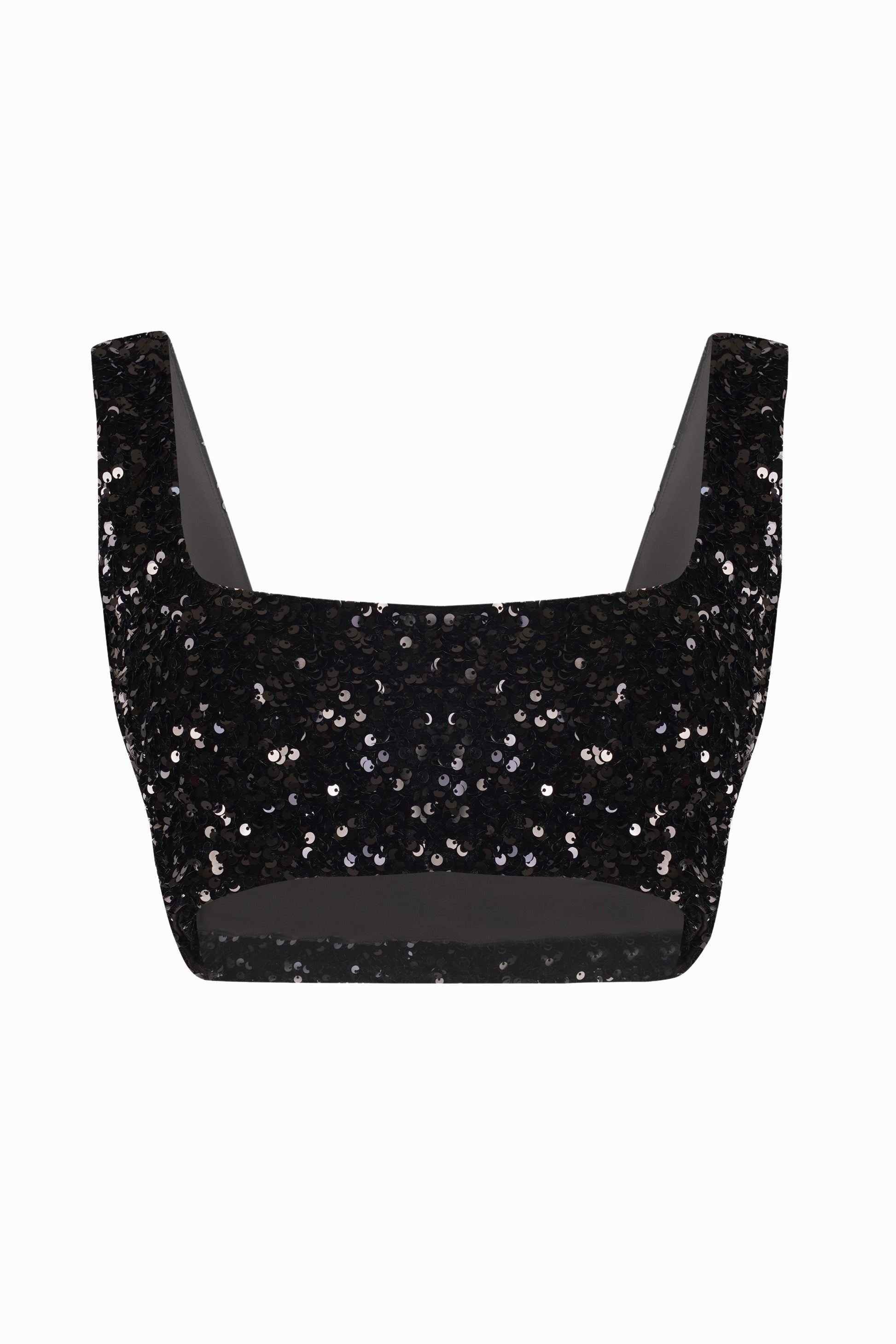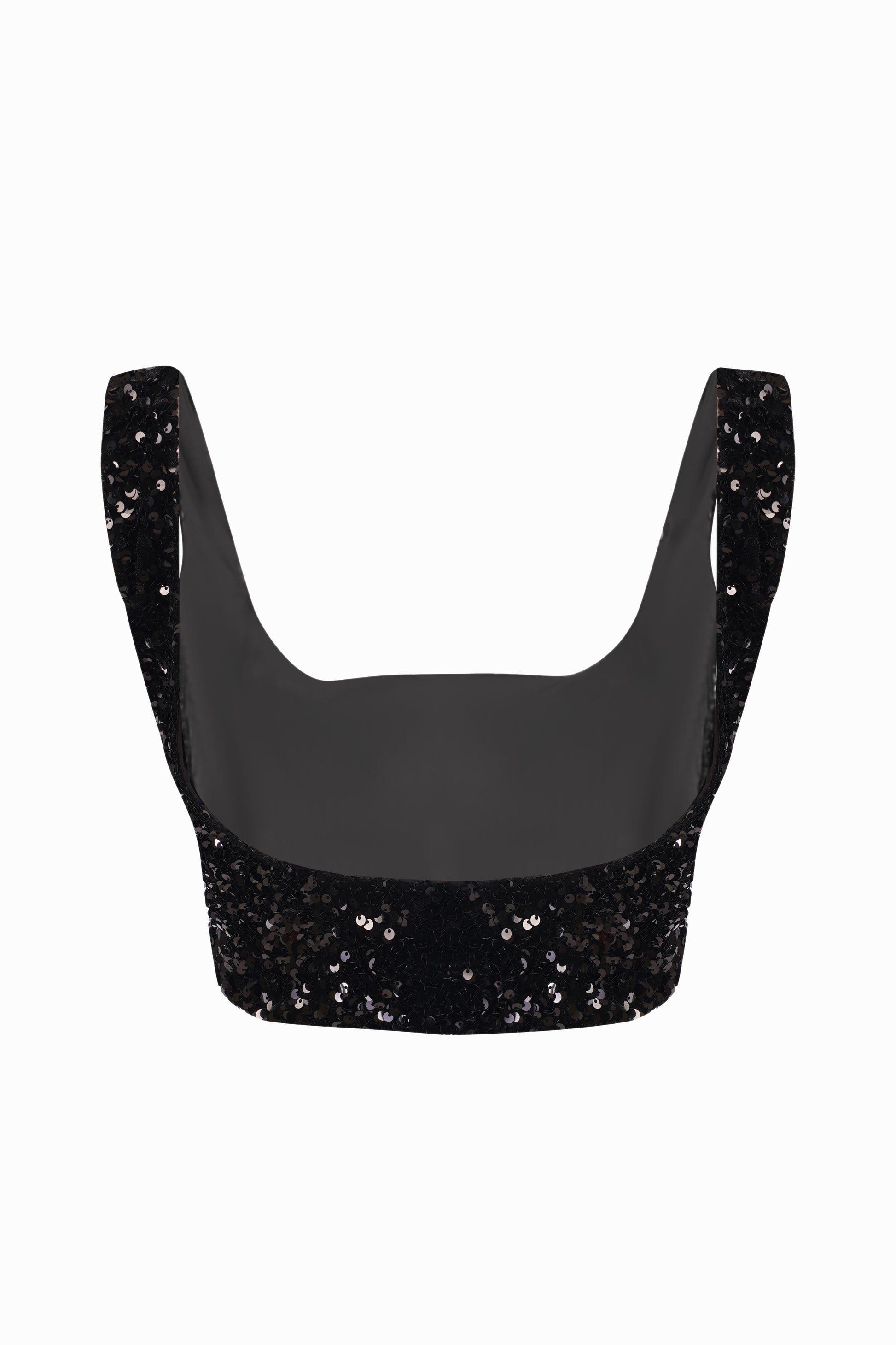 Shimmer meets bold design in this sequined velvet crop top, featuring a striking square neckline and a sleek, fitted silhouette. The structured square neckline and tailored fit create a modern, polished aesthetic, while the concealed zipper ensures a seamless finish. Pair it with the Black Sequins Maxi Skirt for a head-turning outfit.