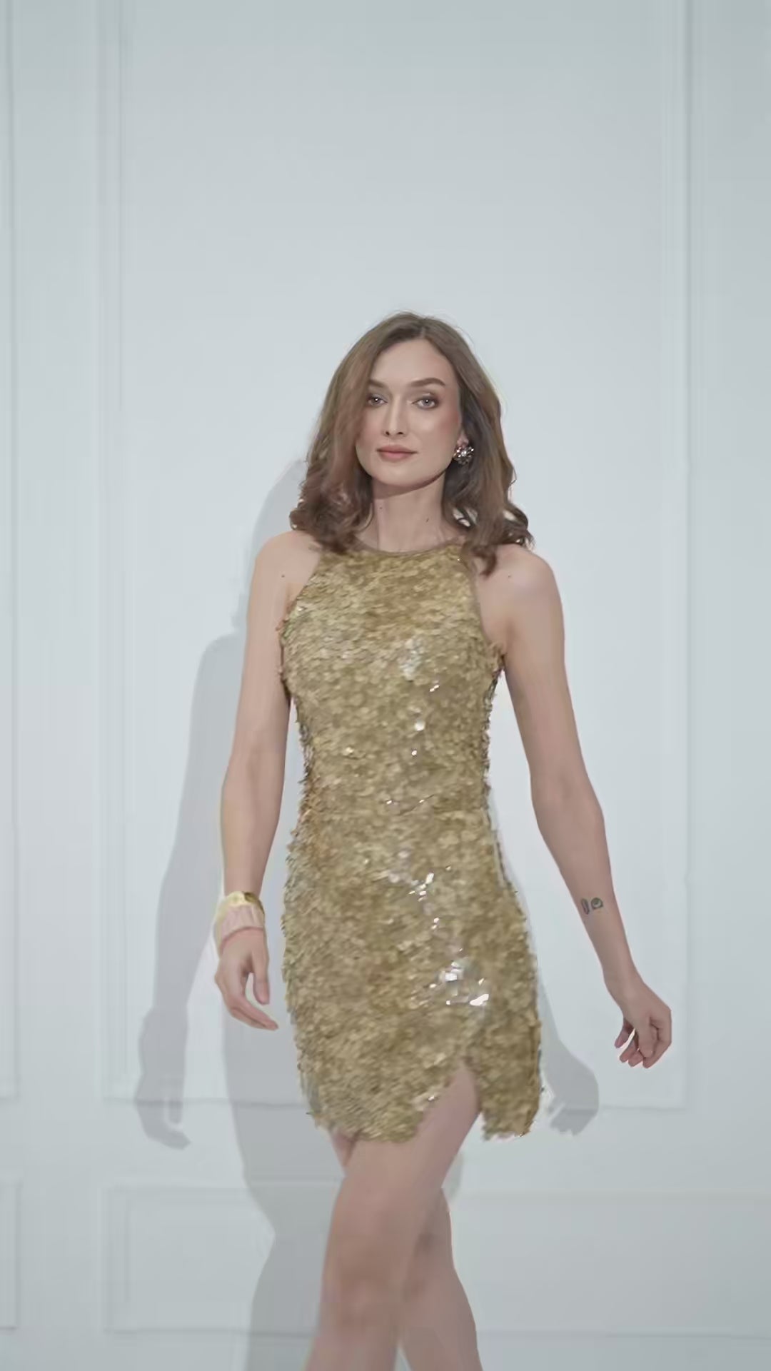 BRIA’s mini plays with texture and geometry—disc sequins stacked like scales and a diagonal wrap front that breaks the shine with a neat slit. The angled overlap that creates a sharp thigh notch. Fully lined so the paillettes move without scratch. The fit is structured and close, skimming rather than hugging. Build the full set with the BRIA Sequins Bodysuit.