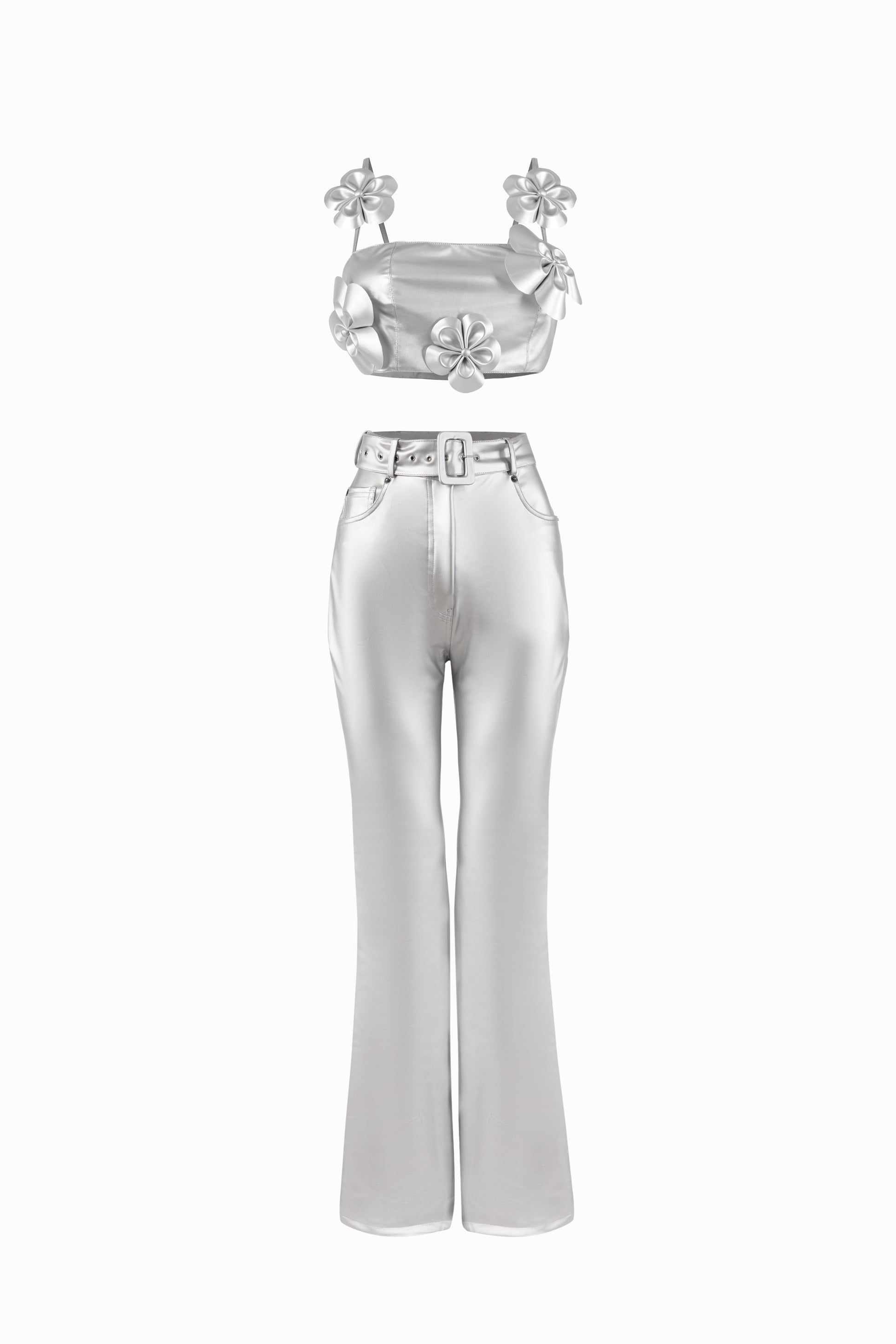 The Celeste Co-ord is a futuristic power pairing in metallic matte faux leather. The 3D floral crop top adds playful dimension, while the sleek, high-waisted straight-leg pants bring structure and shine. A bold, polished ensemble that turns heads effortlessly.