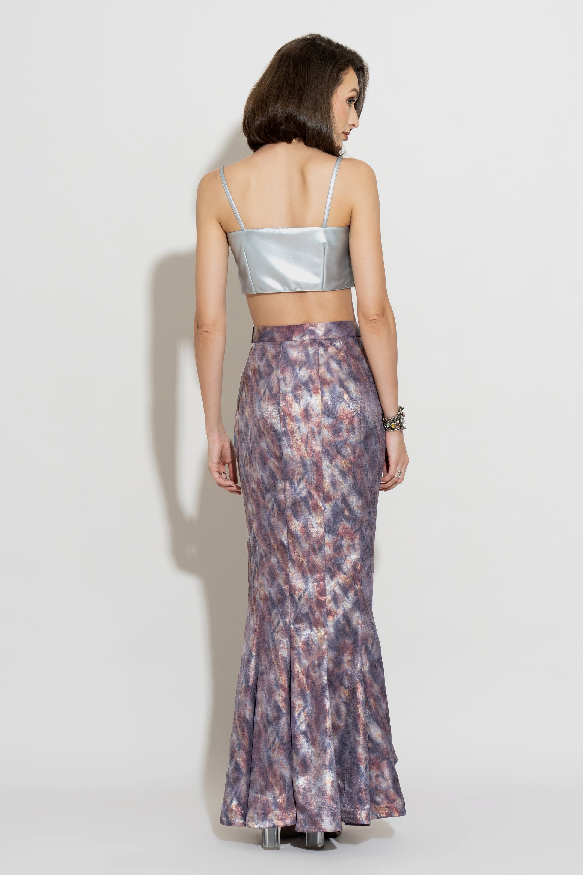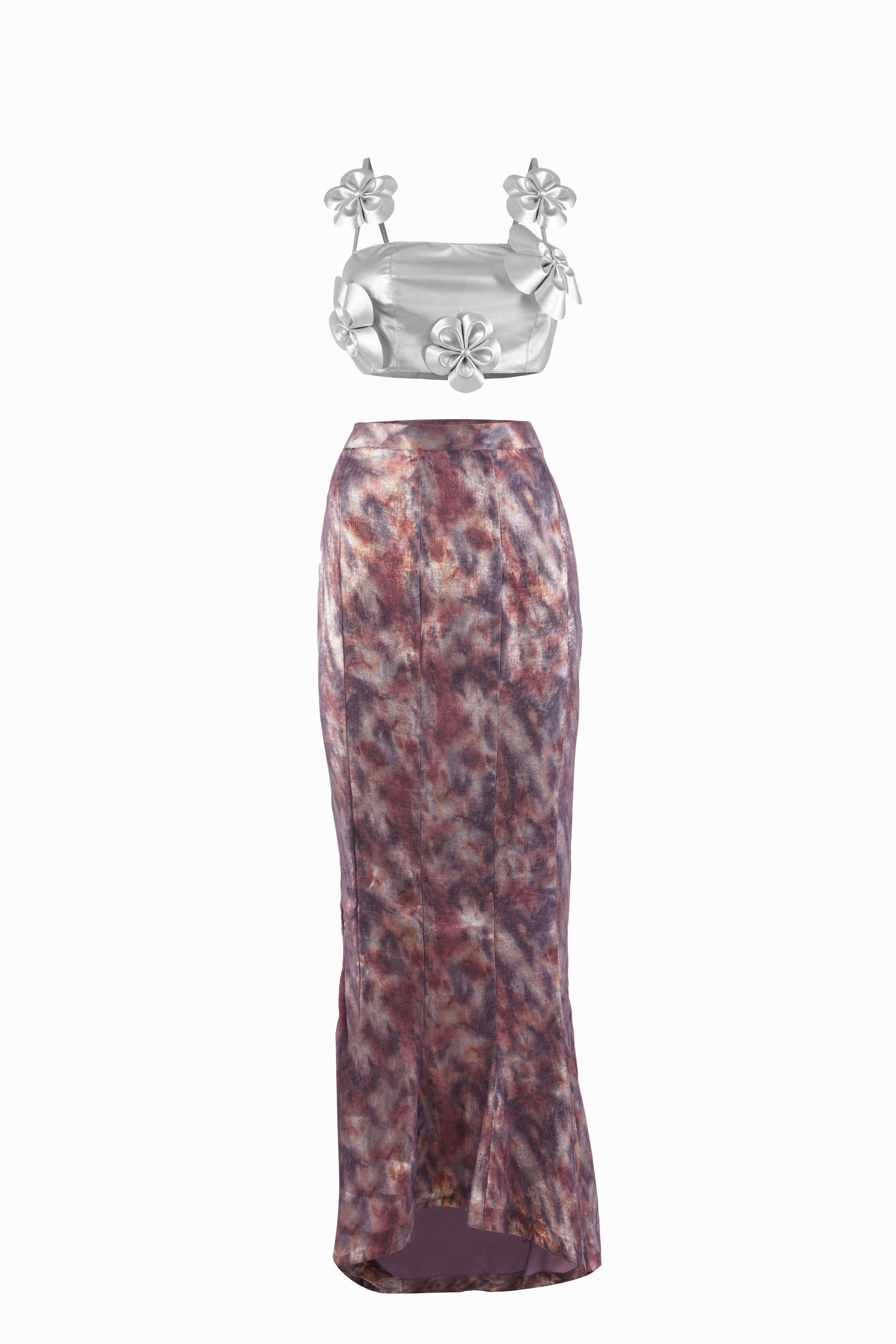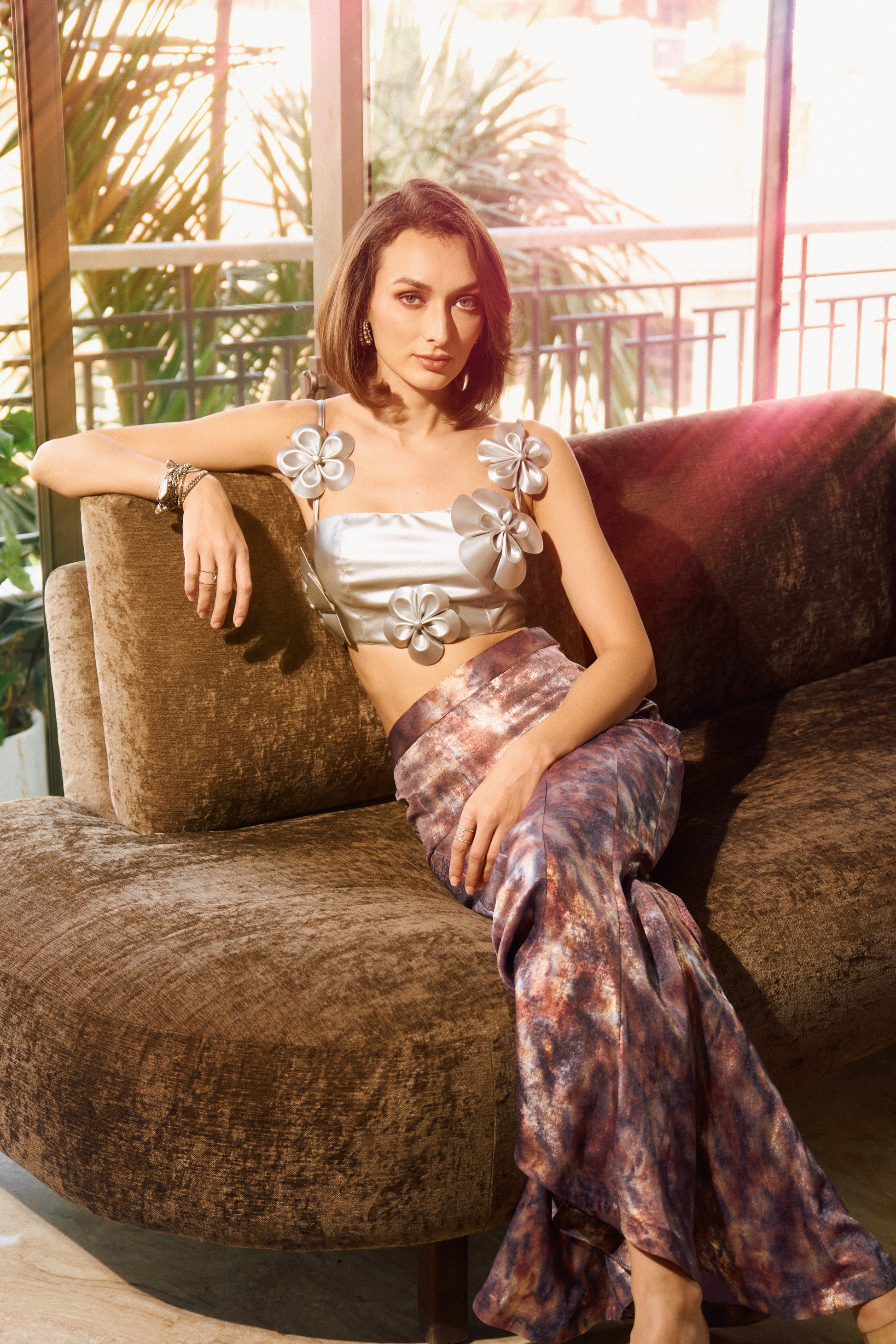Turn heads in the Celeste Flower Top and Viola Ruffle Skirt Co-ord, a perfect blend of structure and fluidity. The 3D floral appliqué crop top pairs beautifully with the cascading ruffles of the metallic foil satin skirt, creating a dreamy yet bold look that shines effortlessly from day to night.