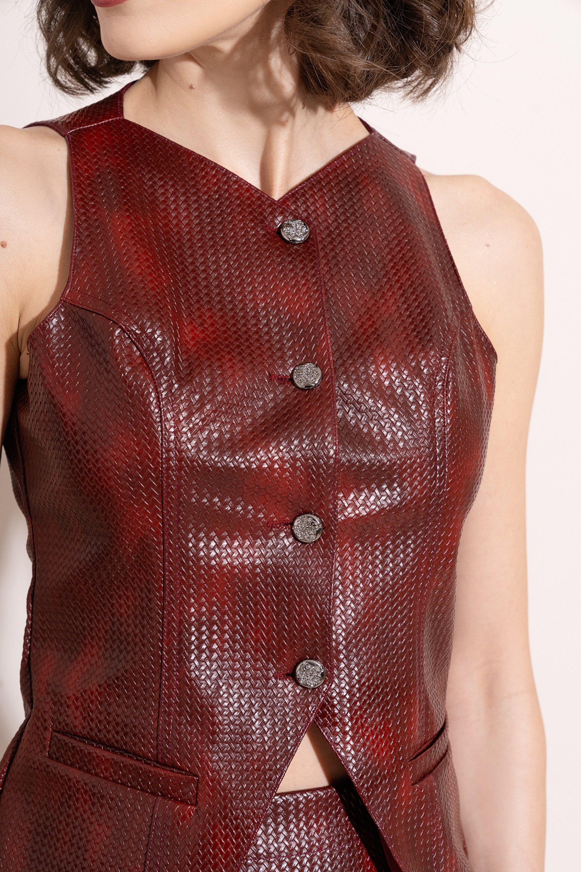 The Cleo Textured Waistcoat is cut from high-shine faux leather with a subtle embossed texture, giving it a structured yet fluid shape. The tailored fit features sculpted seams, front flap pockets, and a sharp V-cut hem that elongates the torso. Detailed with metallic buttons, it fastens down the front for a sleek, polished finish. Style it with the Cleo Textured Mini Skirt for a coordinated, high-impact look.