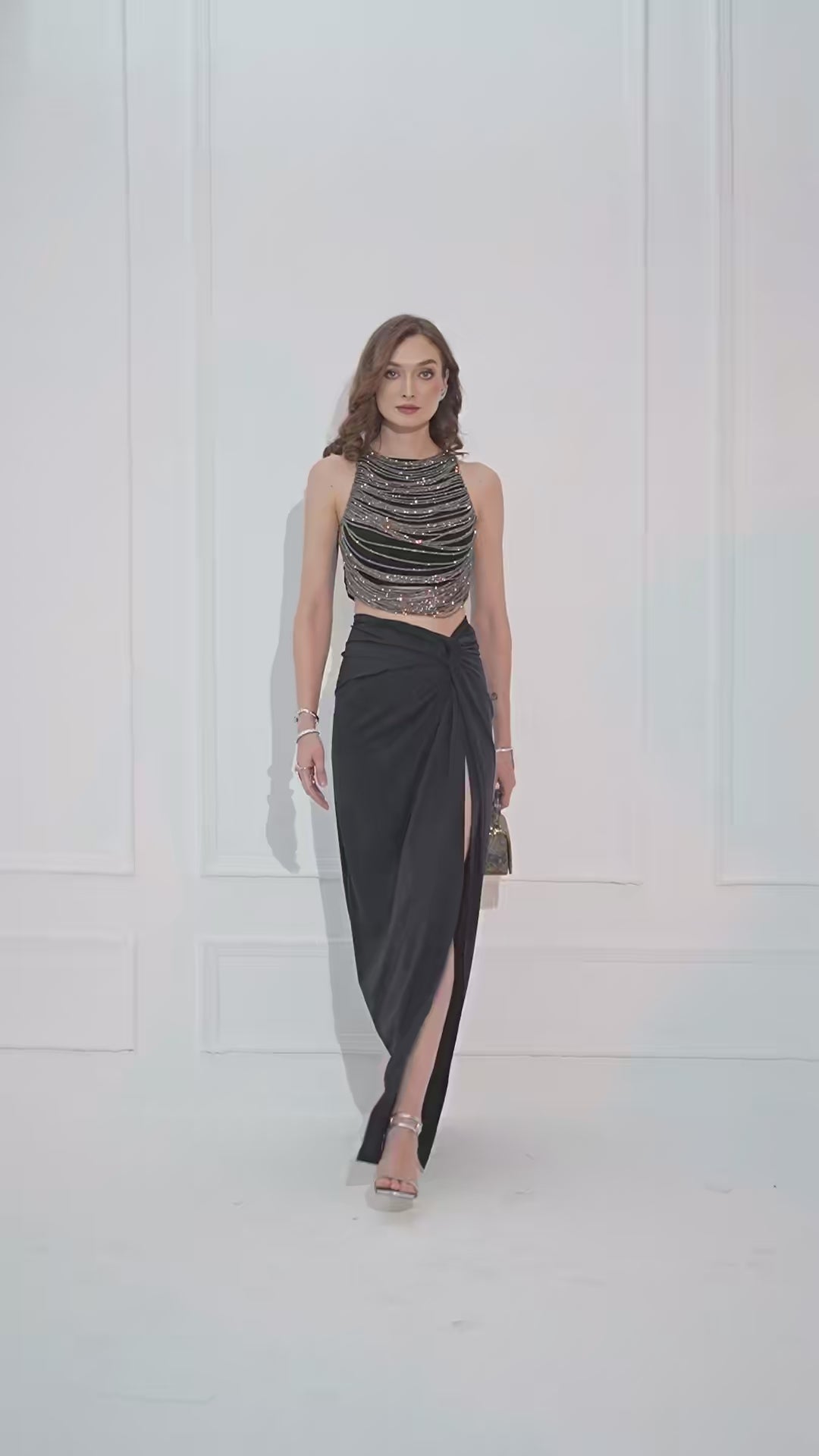 A high-shine crop meets a fluid column: the Eloise racer top drips in hand-set rhinestone cords that cascade like layered chains, while the Kylie skirt knots at the hip and breaks into a dramatic thigh-high slit. It’s the kind of co-ord that turns a corridor into a runway (and photos into keepsakes). A black on black set, but it's anything but ordinary.