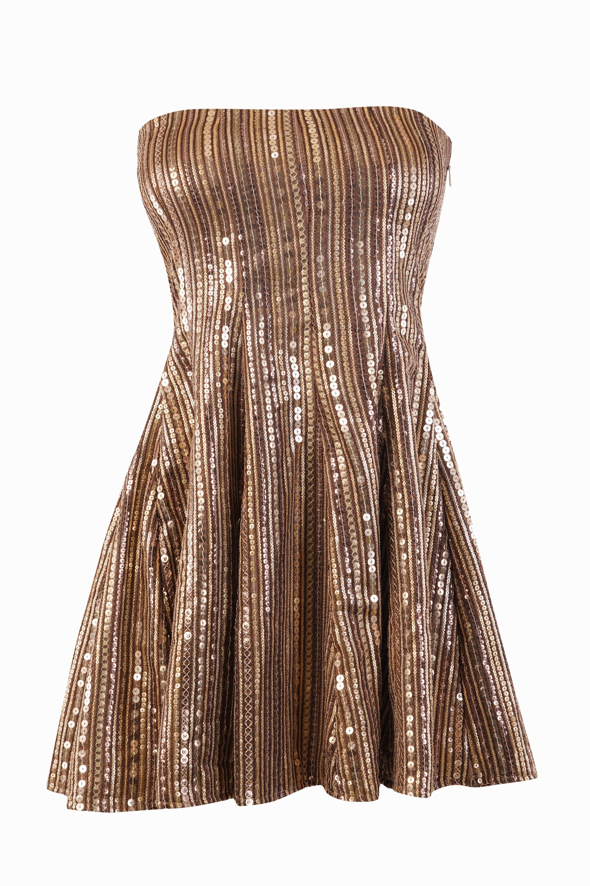 Shine at every event with this gold sequined tube dress, designed in a fit-and-flare silhouette for effortless movement. Crafted from shimmering georgette with vertical sequins, the structured bodice hugs your frame, while the flared skirt adds drama and charm. A concealed side zipper ensures a seamless fit, making this dress perfect for party season.