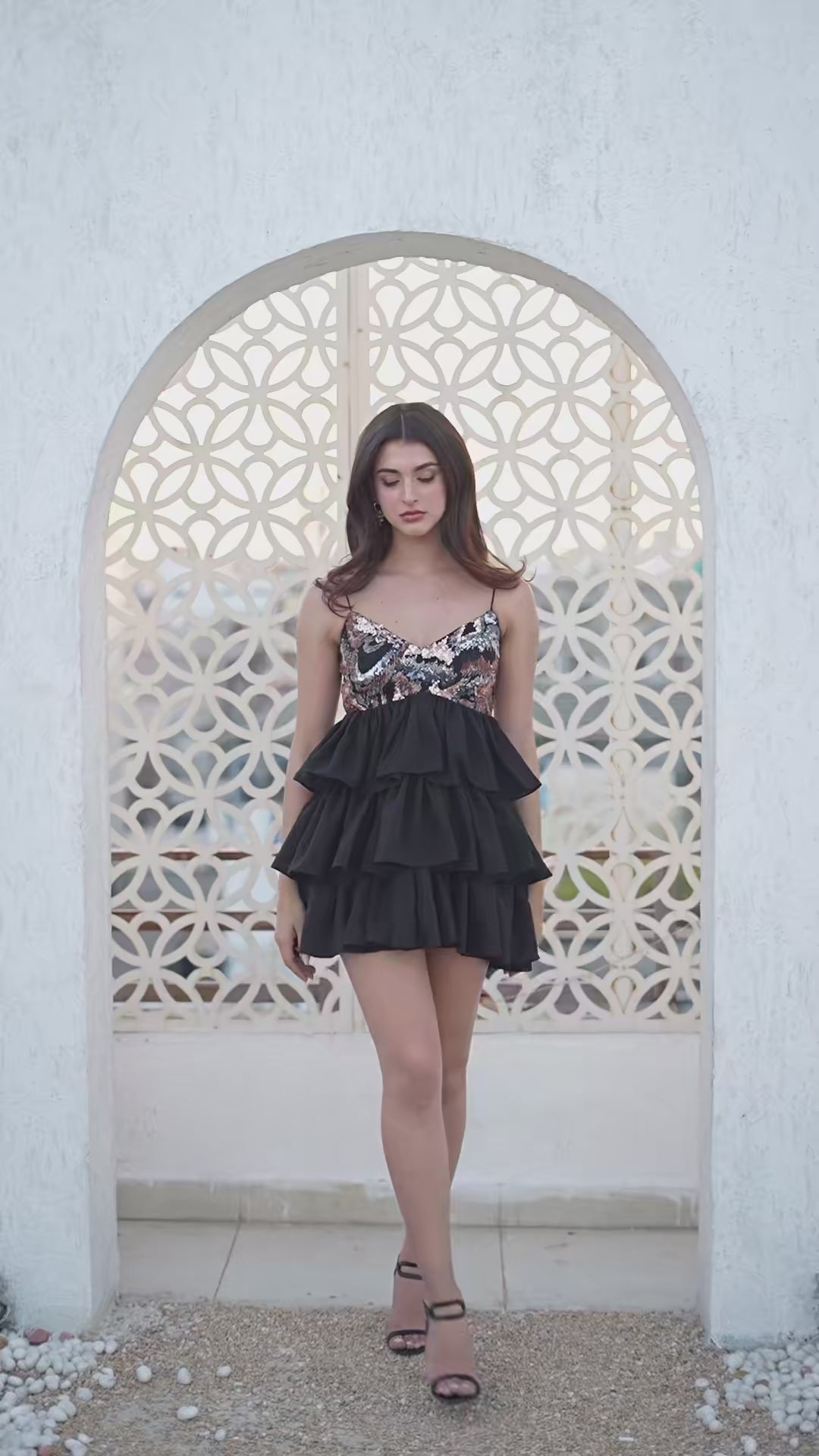 Harper stands out with its strong fabric contrast — a sculpted sequin-on-net bodice layered over soft black georgette tiers. The abstract sequin pattern in copper, gunmetal and champagne tones catches light beautifully, while the airy ruffled skirt keeps the shape fluid. Slim straps and a clean neckline balance the volume through the hem. A solid choice for cocktail nights, birthdays or after-hours plans.