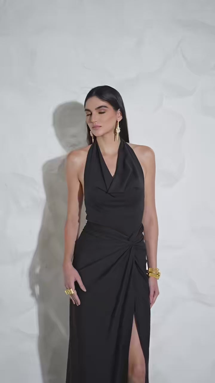 A clean cowl halter that skims the bust and anchors at the neck for an easy drape. The Kylie Cowl Top has a backless frame and is waist-length which creates a long, neat torso line. The soft lycra has give, so it moves with you and stays smooth under high-waist pieces. Pair with the Kylie Draped Skirt for a sleek two-piece moment, or tuck into the Lisa Tiered Skirt/Emma Cutwork Maxi Skirt for texture contrast.