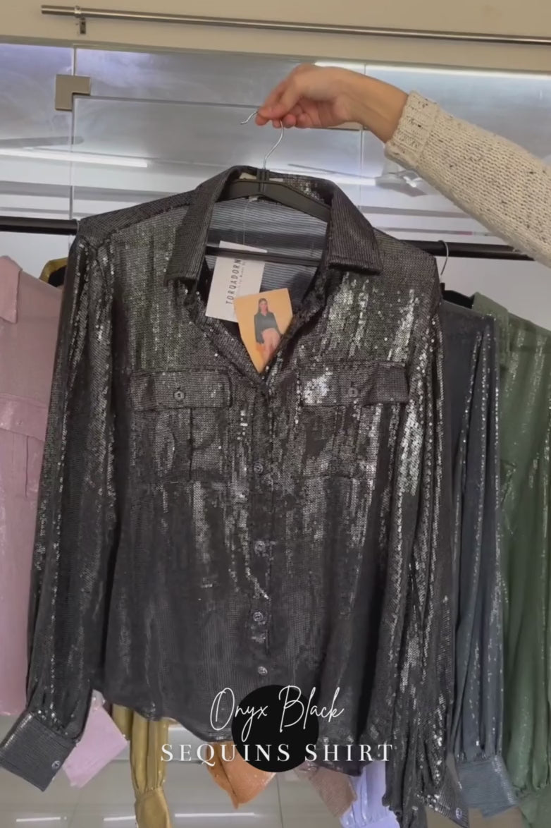 A chic sequins shirt in a heavenly onyx black colour with front flap pockets and balloon sleeves, will have you looking at your wardrobe in a whole new way. It will bring a new pizzazz to so many pieces in your collection. Just perfect for any glam occasion.