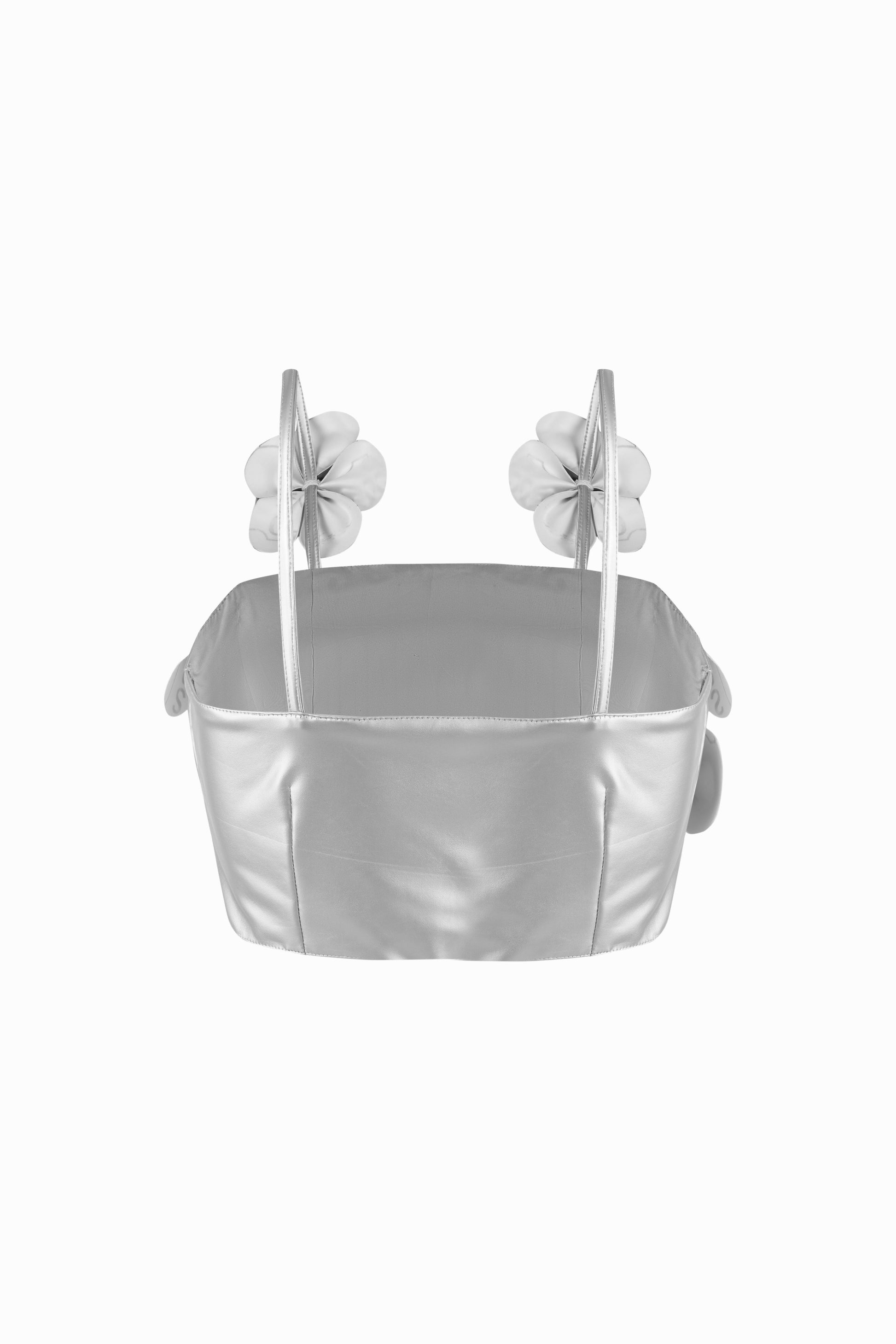 Sculpted from matte faux leather, this silver crop top is a true showstopper with 3D handmade floral appliqués that add texture and intrigue. Designed with a cropped length, it’s fully lined for comfort and fitted with a concealed side zipper for a sleek finish. Pair it with the Silver Faux Leather Pants for a futuristic co-ord or style it with the Purple Shimmer Ruffle Skirt for a playful twist.