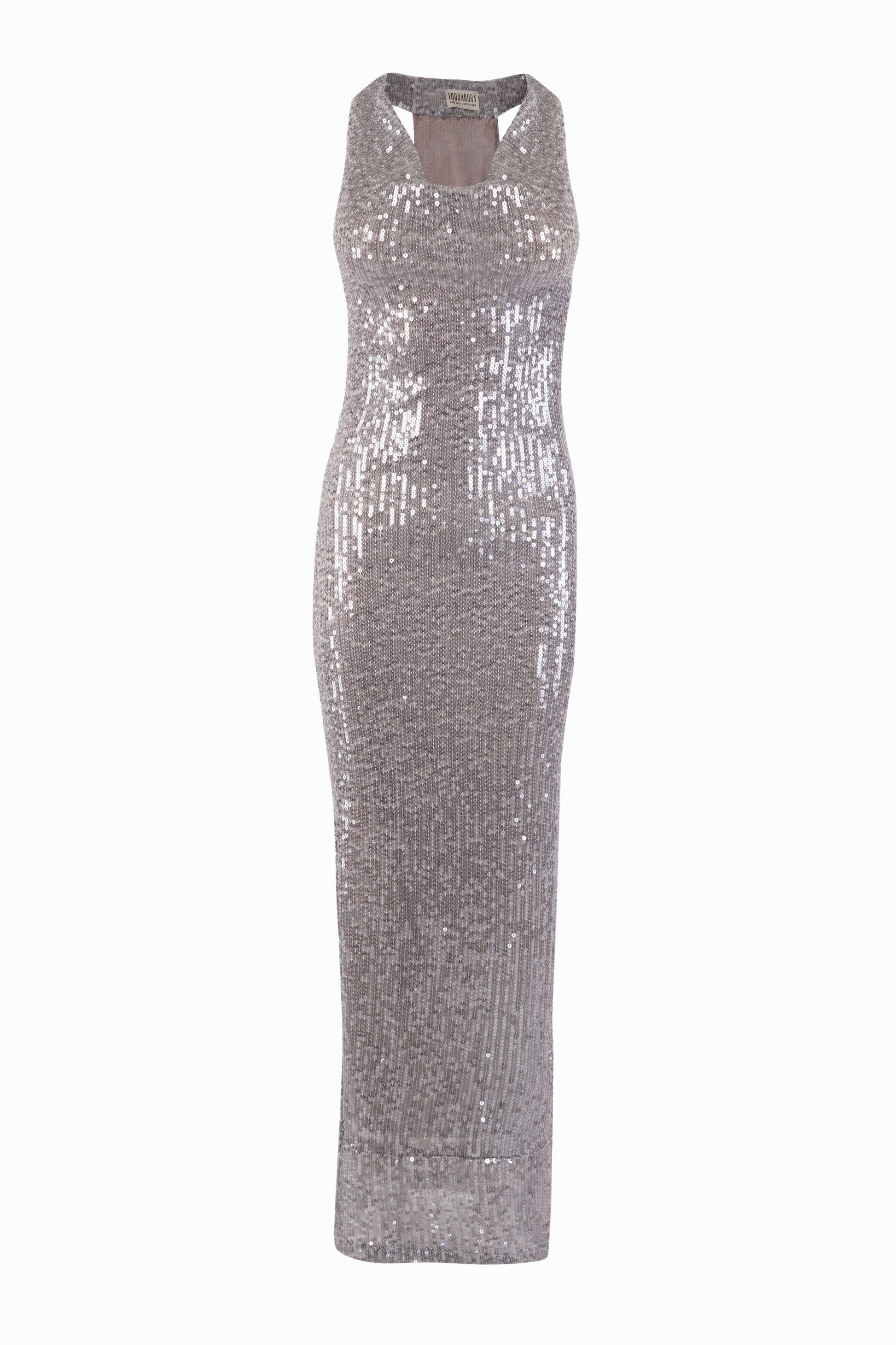 This shimmering silver gown is a showstopper, featuring a draped neckline and all-over sequins for a dazzling effect. Designed with a side slit for added movement and a concealed zipper for a seamless finish, its stretch fabric ensures a flattering fit. Pair it with bold accessories for a red-carpet-worthy look.