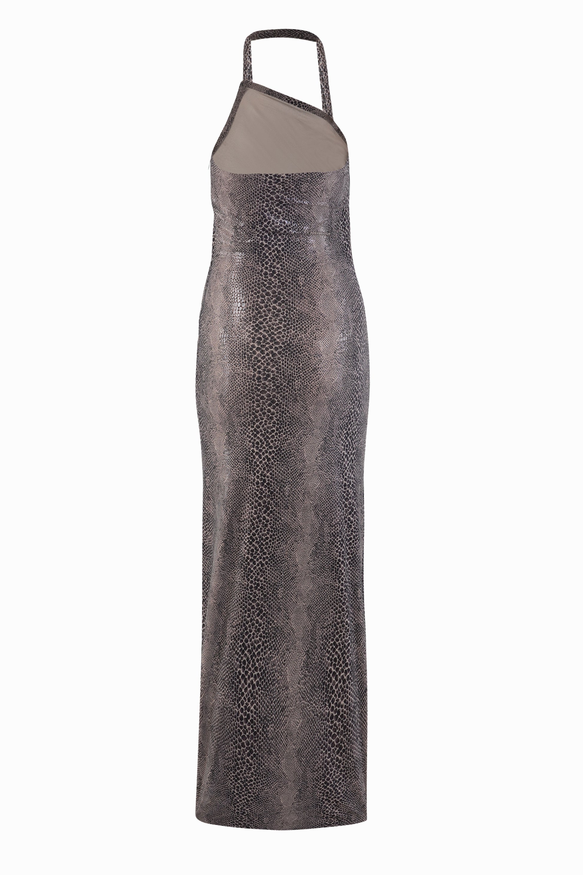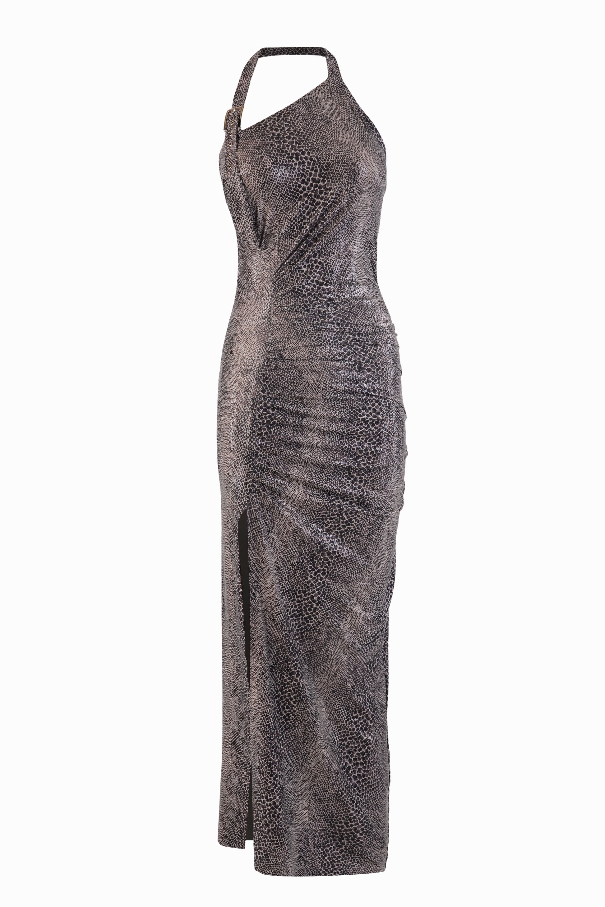 This snake-print one-shoulder dress combines sleek design with bold details. The semi-ruched bodice flatters the figure, while the rivet and buckle accents on the strap add a modern twist. The dramatic side slit enhances movement, making it an ideal choice for turning heads at special occasions.